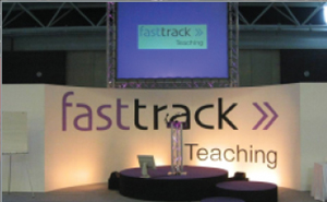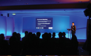 This bespoke set was built to suit the size and shape of a pentagonal lecture hall. In keeping with the theme of the conference, it has an interesting curved cyc as its focal point, designed to look like a running track.