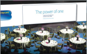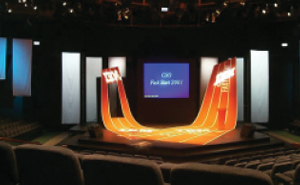 Curved panels made from perspex which, when lit from behind, can create a kaleidoscope of colour to support the brand. With a central 9’ x 12’ rear projection screen, this set was purpose built for quite a wide conference room.