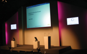 This simple yet stylish set allows for individual branding on the two banners. The screen can be used with front or rear projection and the height and width can be adapted to fit your conference venue.