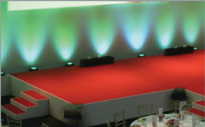 This large centre screen is surrounded by panels that would normally be used in a dance floor. The panels have a colour changing mechanism which allows easy colour transformation to suit branding and entertainment.