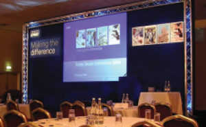 This option looks bold and contemporary and allows you to fill width ways for a bigger venue. Branding can be shown via the four banner sites. A single screen allows front and rear projection of both data and video.
