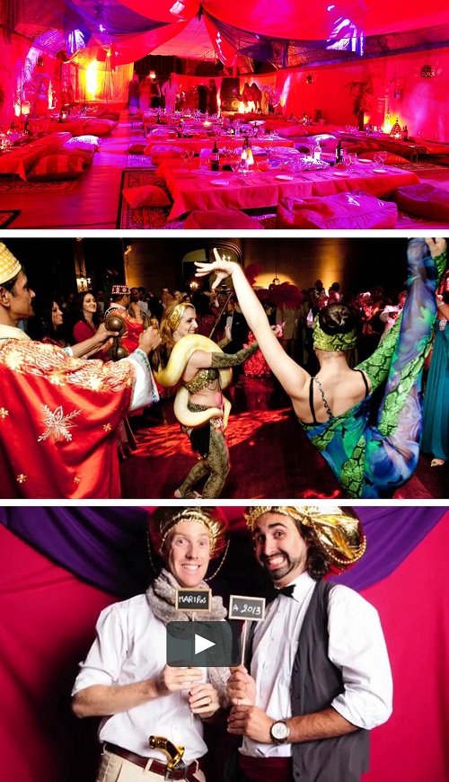 Theming package may include: Red carpet, lantern lamps, hukka pipes, spices, suspended lit lanterns, karts with straw baskets, snake charmer, mosaic arched doorway, cushions.