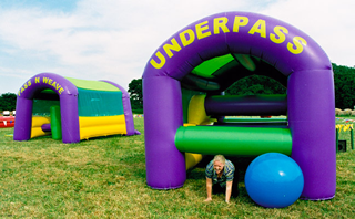 Another team relay race. Two members of each team dash to transport a giant orb through the obstacle course. Then, by balancing the orb on top of a giant bucket, they hand over to the next two runners. The ball is 1.5m across so it will be difficult to get through the covered inflatables to say the least. The winning team is the one scoring the most ‘baskets’ in the 2 metre hoops at the end. Fabulous Fun!