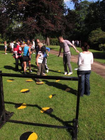 Teams must traverse a minefield field using only the safe stepping stones and get over and under the obstacles. No member of the team is allowed to touch the ground with any part of their body and they are only allowed to step on the discs provided.