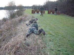 Using a replica training grenade, recruits hit a series of targets at various distances. A successful throw will detonate a battlefield pyrotechnic. As if that wasn’t exciting enough, grenades are thrown from standing and prone positions after a crawl through a net tunnel.