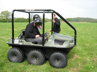 An amphibious 6-wheel drive, off-road vehicle with power to all wheels for optimum performance in challenging terrain and a one-piece ergonomic handlebar steering control.